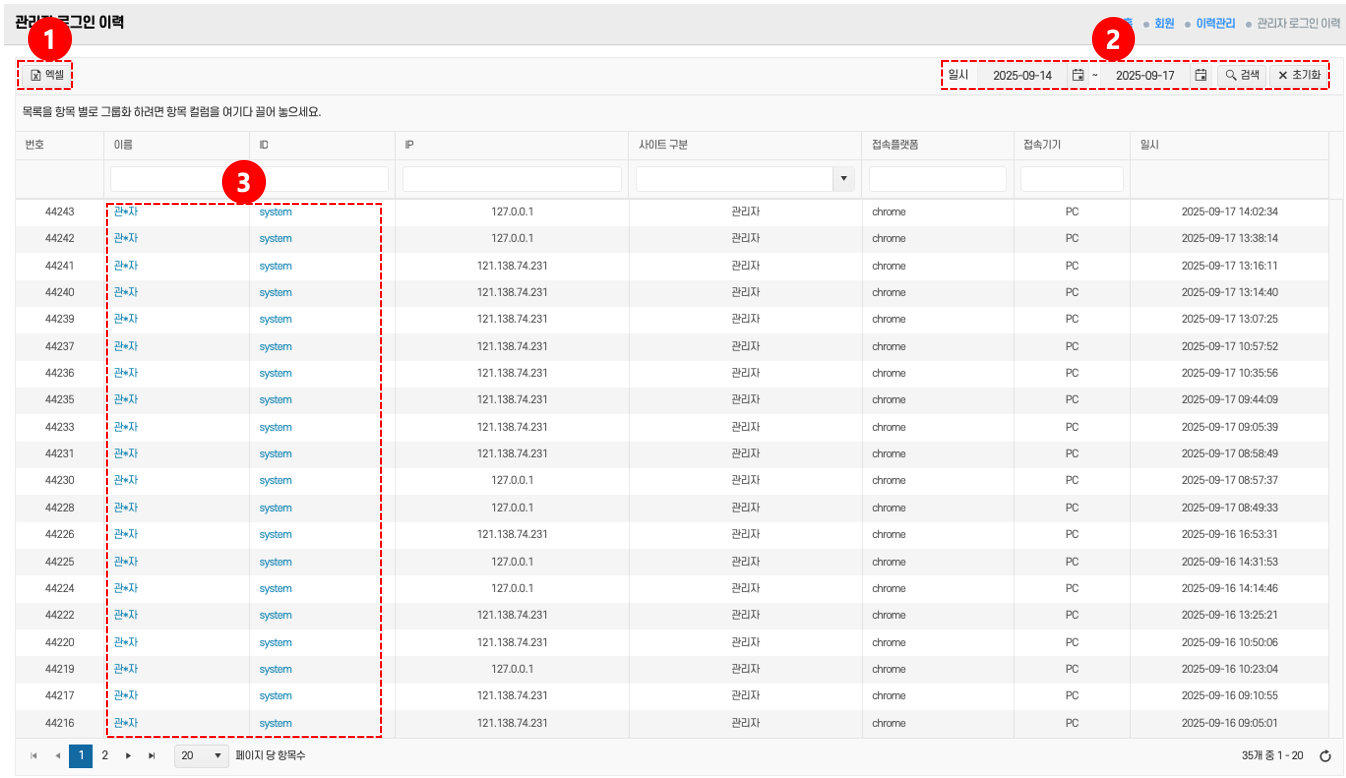 검색: 상단의 검색창 ②에서 날짜를 입력 후 검색 → 기간 내 로그인 내역을 조회한다.